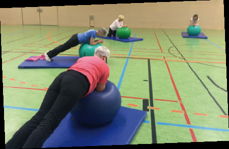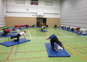 Es wird ohne Geräte geturnt und sich u. a. mit Gymnastik, Faustball und speziellen Rückenübungen fit gehalten.